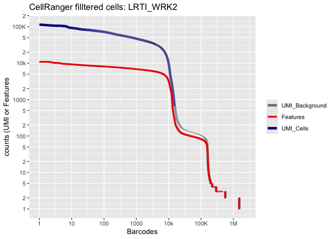 Imagine the barcode rank plot from the Cell Ranger web summary. That graphic plots the number of UMIs against the barcode rank, and typically has a sharp inflection point where the number of UMIs drops dramatically. These points can represent a transition between cell types from a higher RNA content population to a lower RNA content population, or from cell-associated barcodes to background.