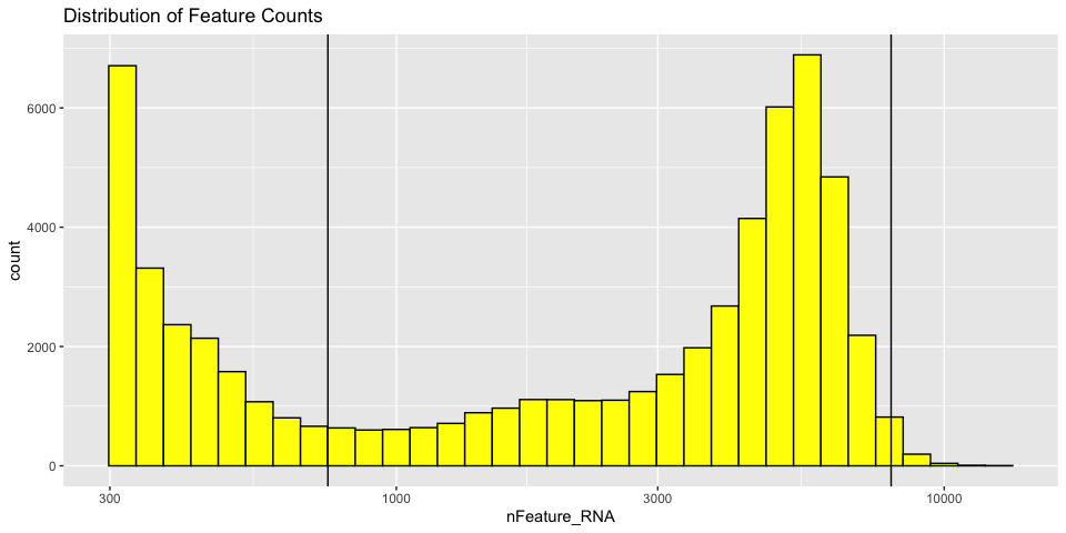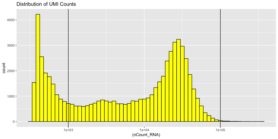 The goal of cell filtering is to remove cells with anomolous expression profiles, typically low UMI cells, which may correspond to low-quality cells or background barcodes. It may also be appropriate to remove outlier cells with extremely high UMI counts. In this case, the proposed cut-offs on the high end of the distributions are quite conservative, in part to reduce the size of the object and speed up analysis during the workshop.